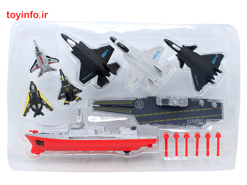 این مجموعه از یک ناوگان کامل و متنوع از یگان های رزمی دریایی و هوایی تشکیل شده است. شامل ۱ کشتی فرماندهی با قابلیت شلیک، ۱ ناو هواپیمابر، همراه با چند تیر موشکی قرمز رنگ است. همچنین ۶ عدد جت جنگنده مدرن با طراحیها و رنگهای متنوع برای انجام ماموریتهای مختلف از جمله دفاع هوایی، حمله و شناسایی داخل بسته بندی این محصول قرار دارد. ویژگی جذاب اسباببازی جنگی ناوگان دریایی، بزرگترین کشتی آن است که یک مرکز کنترل آتش متحرک و پیشرفته است.